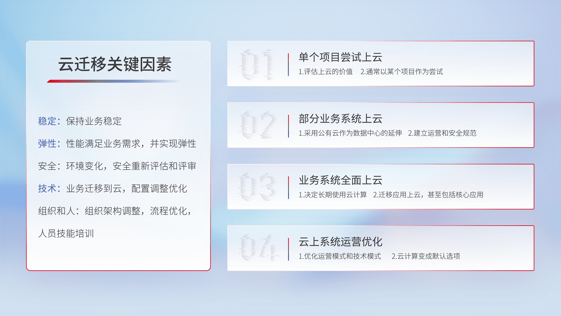 结合实际业务,,从规划设计、、、云平台选型、、、、云原生改造、、、数据迁移、、、、集成交付,,,,迁移全过程为客户识别最佳上云路径,,,,做好风险识别管理,,设计网络架构、、、、身份权限、、安全审计合规、、操作审计、、日志审计、、监控告警策略、、多站点容灾设计等,,,对云上基础设施进行整体规划,,,提升IT治理水平,,以满足弹性、、、高可用、、、、高性能的需求。。