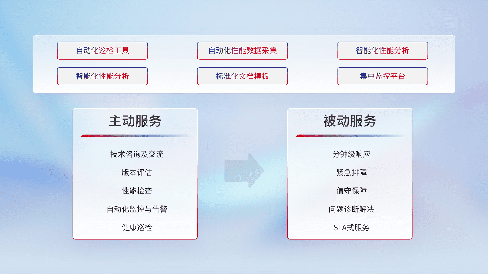 智能化工具和标准化文档,,,,保障服务质量,,,,提供主动服务(包含技术咨询、、、、版本评估、、、、性能检查、、、、自动化监控与告警、、、、健康巡检)和被动服务包含(分钟级响应、、、、紧急排障、、、、值守保障、、问题诊断解决、、SLA服务)。。。。